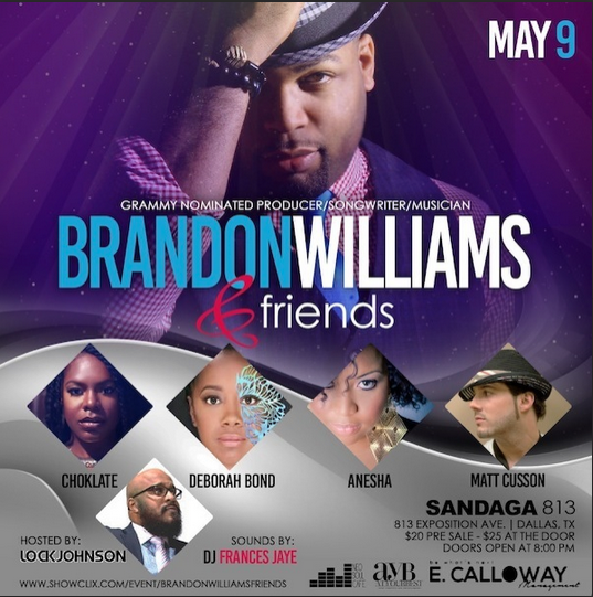 Join us on Mother's Day weekend for an amazing Live Music event! Grammy Nominated Producer and Artist Brandon Williams is live and he is bringing his friends with him. Join him, Choklate, Deborah Bond and Anesha, & Matt Cusson along with a few more surprises live!