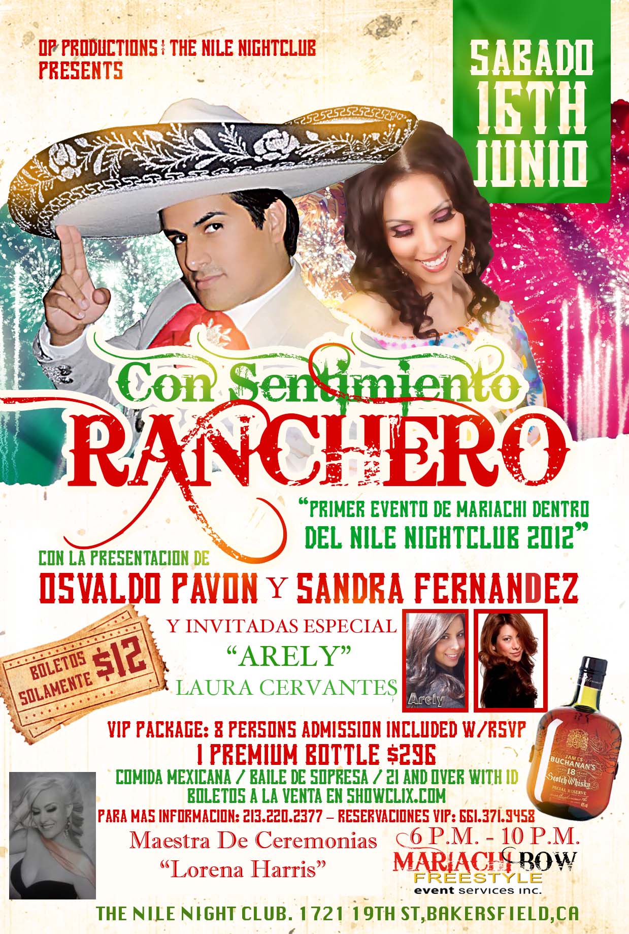 Acompañados por El Mariachi "Los Mensajeros" de Nacho Nunez. Compren sus Boletos hoy sera una velada inovidable indudablemente "CON SENTIMIENTO RANCHERO" Ajua! Gracias en especial a The Nile NightClub Bakersfield, que esta en conjunto en esta Produccion, alla nos vemos :)