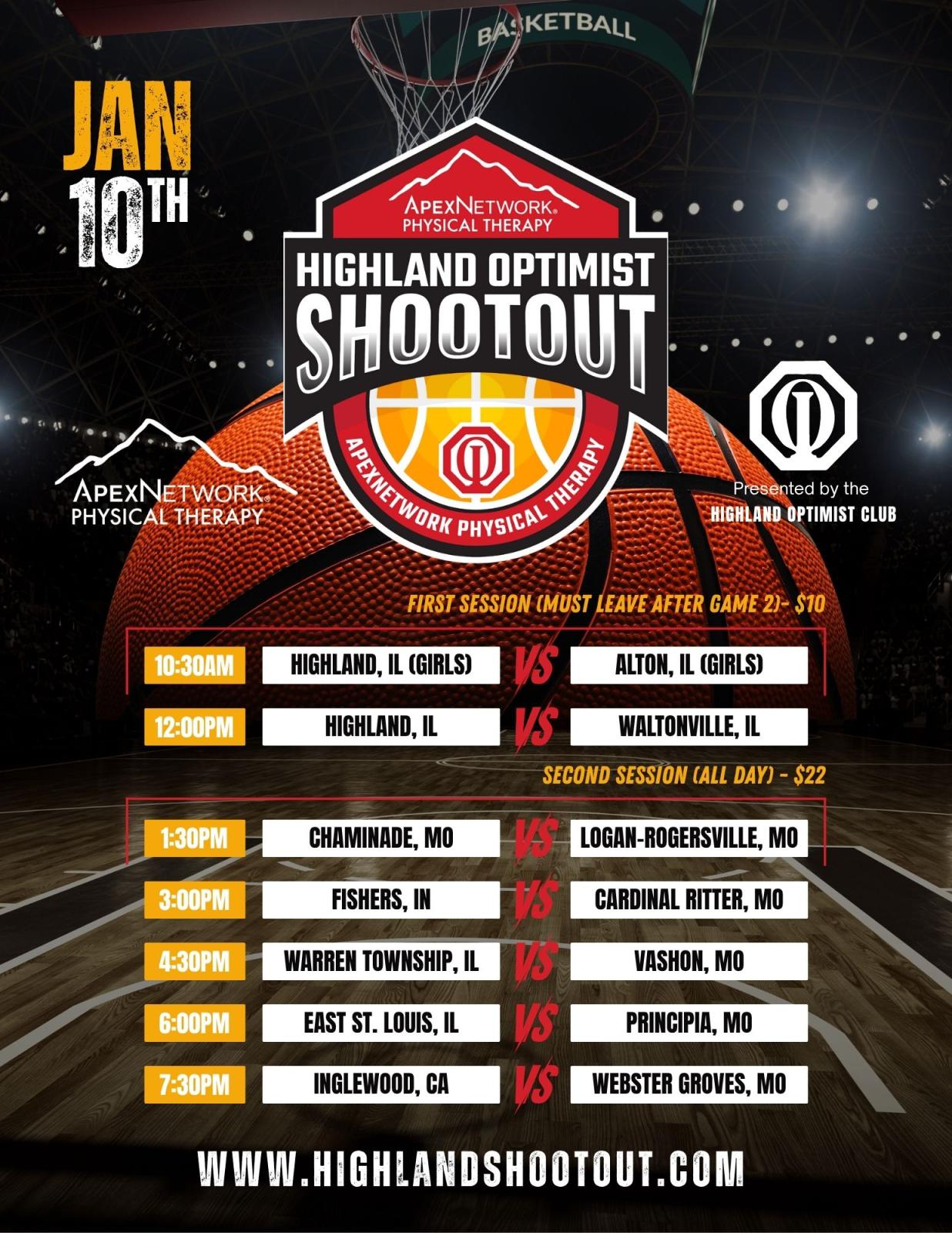 This is the 34th Annual Highland Optimist Shootout Classic presented by ApexNetwork Physical Therapy. "The Shootout" is widely known as the premier high school basketball event in the St. Louis area. With our rich history of vast attendance and remarkable talent, the event will once again bring together some of the top local and national basketball players and teams to one gym for one full day of hoops.