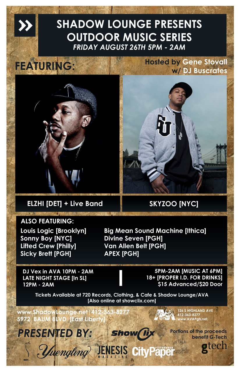 The Shadow Lounge is proud to present Detroit area MC Elzhi, formerly of the group Slum Village, and New York MC Skyzoo for an outdoor concert on Friday, August 26th, at 5pm. Tickets for this special outdoor performance are $15 in advance and $20 at the door. Tickets will be available at Shadow Lounge/AVA (East Liberty), 720 Records, Clothing, and Caf�© (Lawrenceville). Time Bomb (Shadyside), and more locations to be announced.