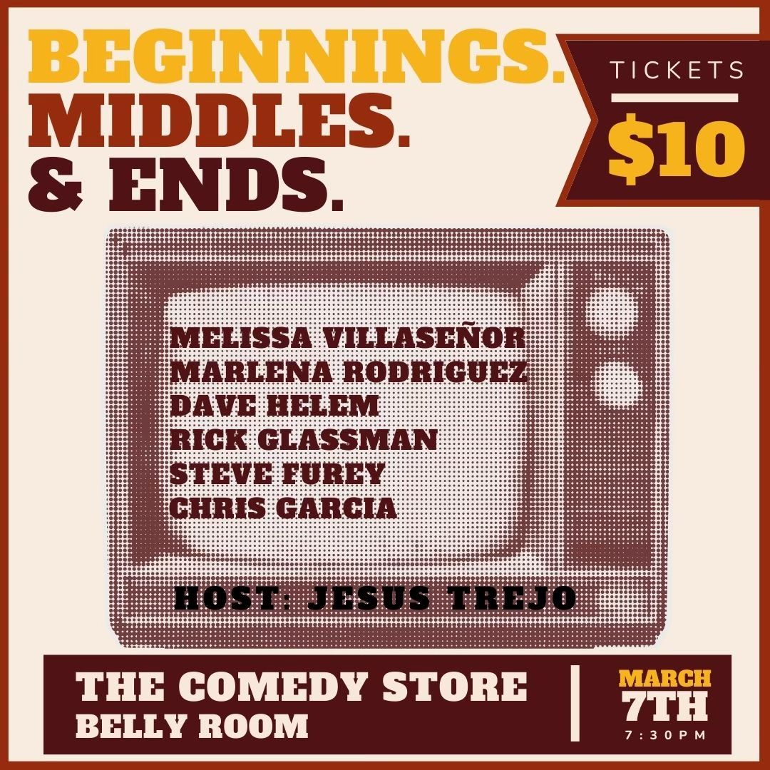 *4 Tickets Available* BEGINNINGS. MIDDLES. ENDS. hosted by Jesus Trejo with Melissa Villasenor, Marlena Rodriguez, Dave Helem, Rick Glassman, Steve Furey, Chris Garcia