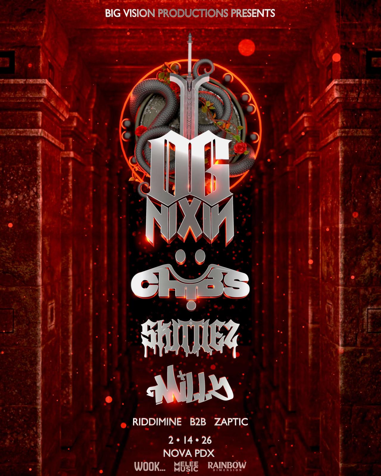 Valentine's Day with OG Nixin, Chibs, and Skittlez! Local support coming from Milly Wubbs, Riddimine, and Zaptic. Thank you for supporting Big Vision Productions.