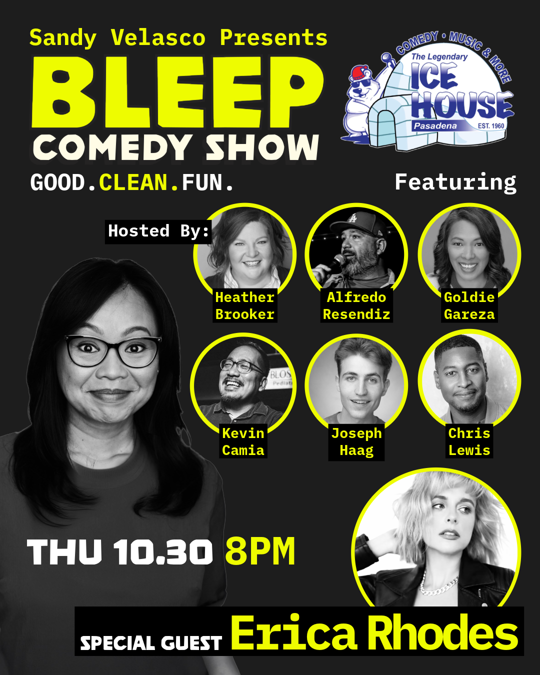 Bleep Comedy is back for more clean comedy that will feature local and national headlining comics as seen on NBC, ABC, Comedy Store, Laugh Factory, Hollywood Improv, Brea Improv, MicDrop Comedy San Diego and more! Sandy Velasco is an actor & comedian who produces clean comedy shows throughout the San Gabriel Valley. For more info, visit her official website: www.sandyvelasco.com Our special guest Erica Rhodes is a comedian and actor who has appeared on America’s Got Talent, The Late Show with Stephen Colbert, Don’t Tell Comedy, ABC’s Modern Family, & NBC's Bring the Funny. Her Dry Bar special, Love You More, has more than 2 million views on YouTube. Sofia Vergara proclaimed Rhodes "The best comedy act she has ever seen on AGT." Check out her website: https://www.ericarhodescomedy.com/