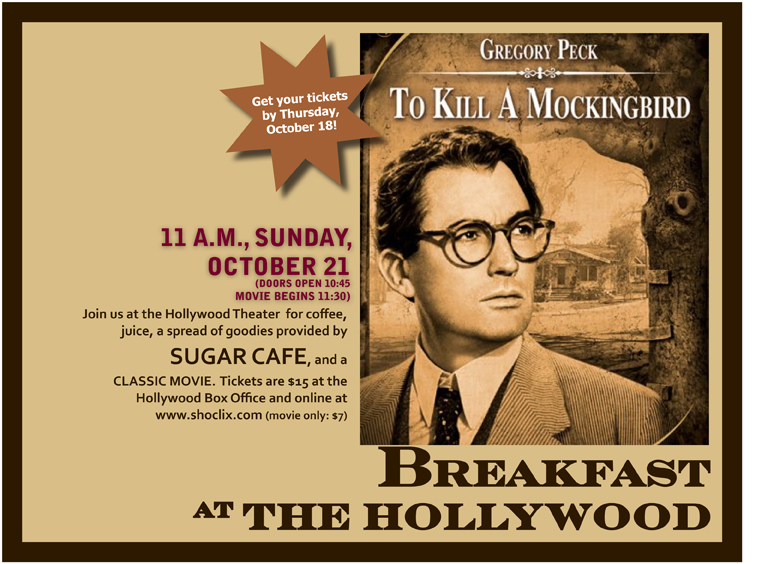 The Hollywood invites classic movies lovers to stop by for breakfast by Sugar Café at 11 and a screening of the beloved Gregory Peck movie To Kill a Mockingbird at 11:30. The movie won Peck an Academy Award and is listed as No. 25 of the American Film Institute’s 100 Best Movies of all time list. Please get your tickets by Thursday, October 18.