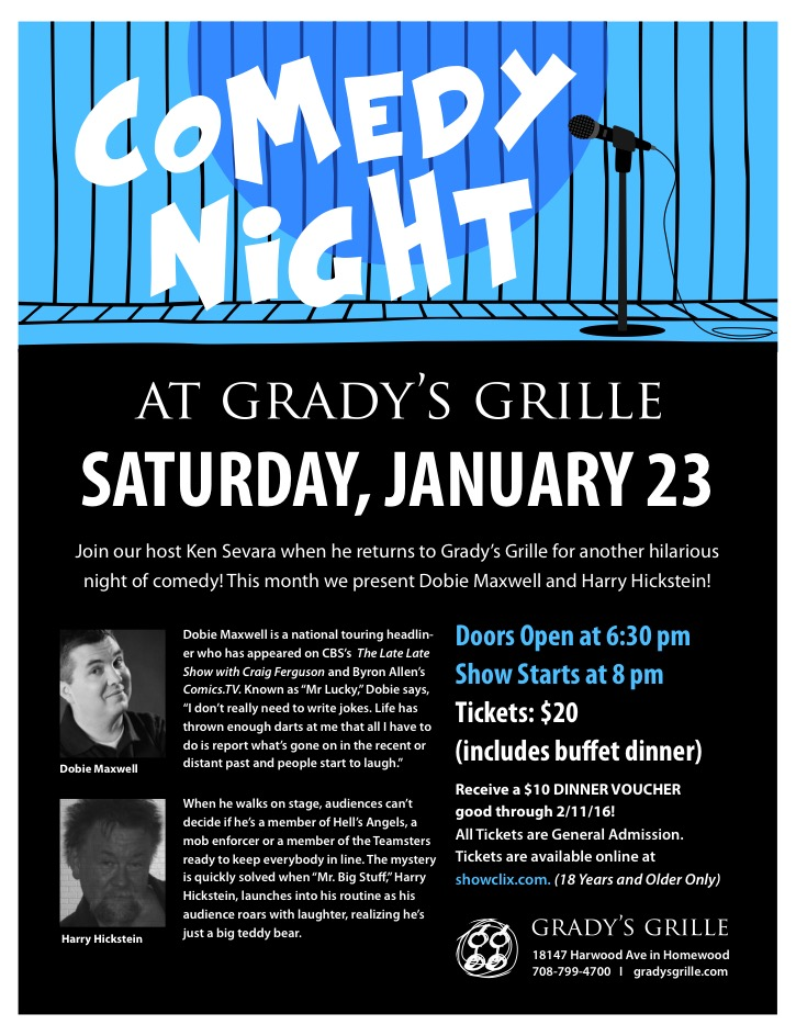 Join us at Grady's Grille when Ken Sevara welcomes Dobie Maxwell and Harry Hickstein for a hilarious night of comedy!