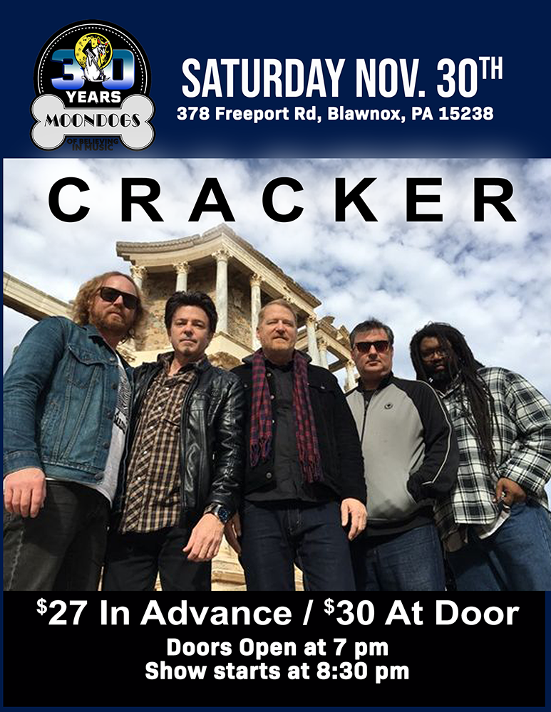 Warning Oh, no! You don't have JavaScript enabled!Javascript is required to use this website and to purchase tickets. Share Website Nov 30 Cracker at Moondogs Sat. Nov 30, 2019 at 8:30pm EST All Ages All Ages Get Tickets Details Event Stats All Ages Event Description Comments Select Tickets Sorry, this event has already taken place. Venue Details Moondog's 378 Freeport RoadPittsburgh, PA 15238