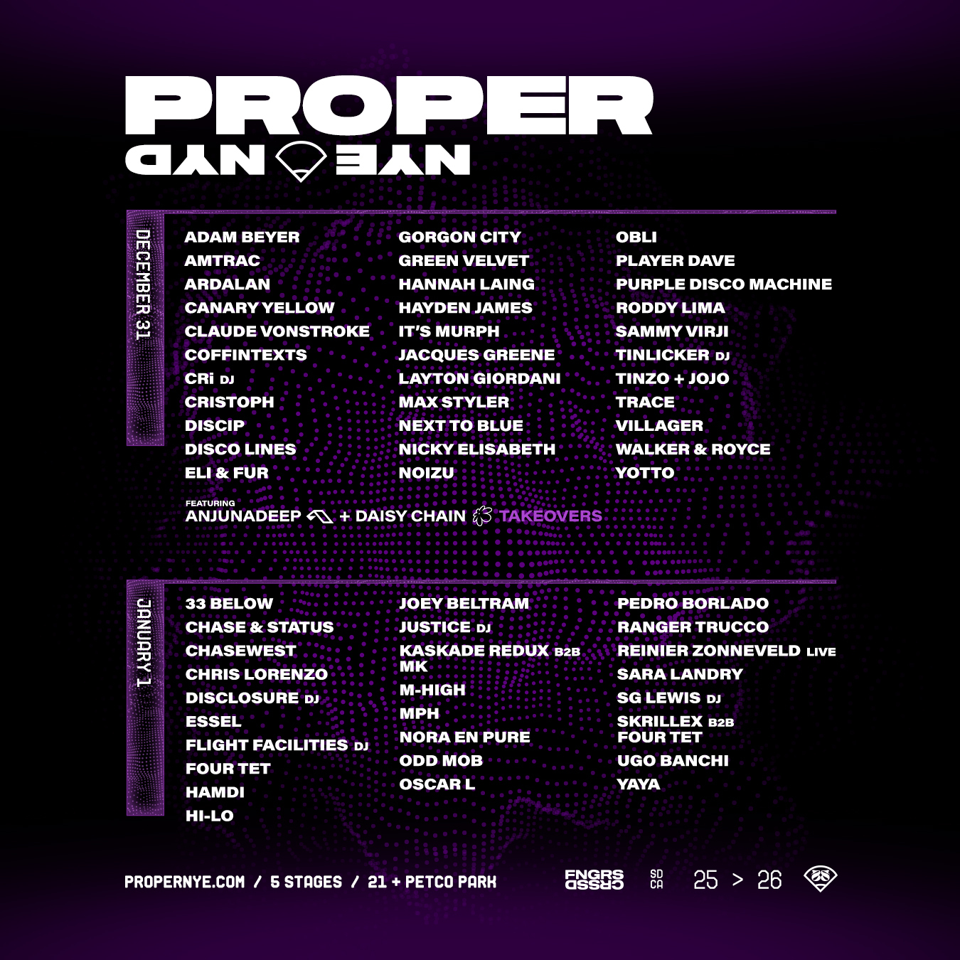 Ticket is for FNGRS CRSSD presents PROPER NYE/NYD, not for a specific artist. Artists, venue, and schedule subject to change without notice. Artist cancellation or change of venue is not grounds for refund. Event takes place rain or shine.