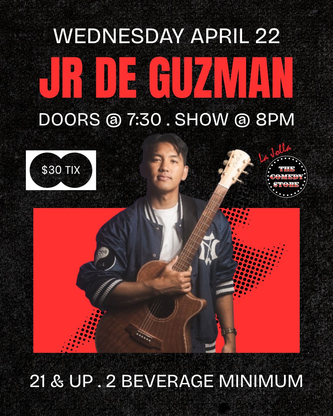 Born in the Philippines and raised in California, JR De Guzman began performing comedy while working as a music teacher, which he quickly learned just meant teaching Taylor Swift songs to teenagers. He has entertained all over the world, having performed for Stand-Up Tokyo and ROR Comedy in Japan, the Jokers Ball in Indonesia, the Badaboom Comedy Series in Amsterdam, and countless other international shows. JR was the winner of Stand-up NBC in 2016, named as a prestigious "New Face" at Just for Laughs 2017, one of Variety's Ten Comics to Watch in 2022, and one of Billboard’s Top 10 Musical Comics in 2025. His quarter hour special on The Comedy Lineup is streaming on Netflix, and his debut hour special "I'm Your Son, Papa" is now available on YouTube. Catch him on tour in a city near you!