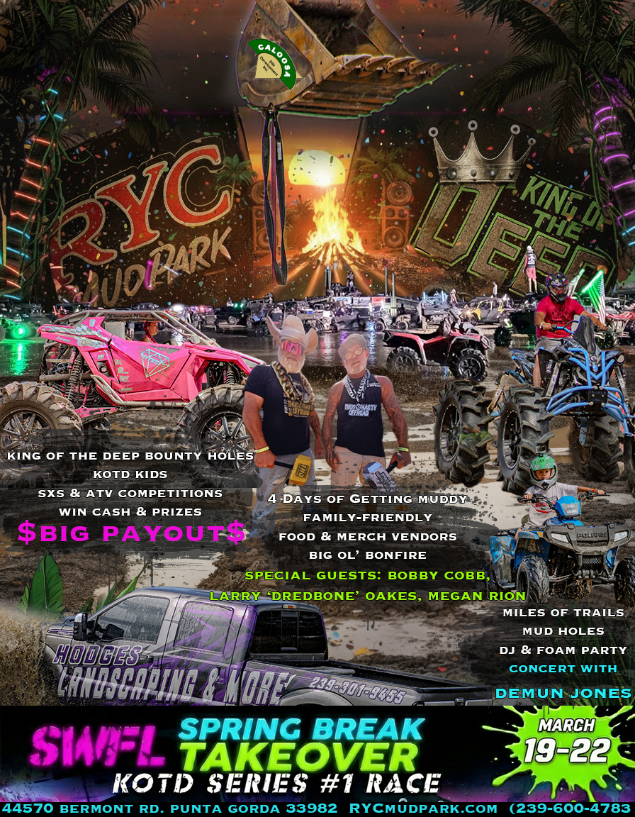 Get ready for mud, mayhem, and family-friendly fun at the King of the Deep SWFL Spring Break Takeover at RYC Mud Park in Punta Gorda, Florida — March 19-22, 2026!