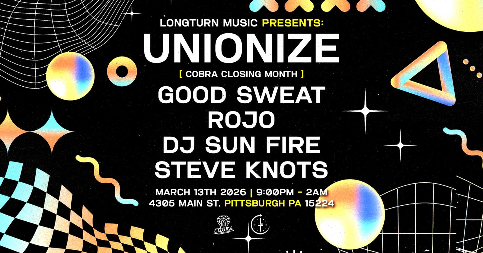 Friday, March 13th come enjoy a night of homegrown heat at Cobra. Good Sweat and Rojo take the reins for a proper showcase of Pittsburgh's underground, filling the room with house, breaks, disco, and beyond. Joining them will be DJ Sun Fire and Steve Knots making their return to the Cobra booth. Both are phenomenal producers and have played live sets for us before jumping on the decks to DJ one last time for us at Cobra. Unionize was built to spotlight the talent right here in our city, and this lineup delivers.
