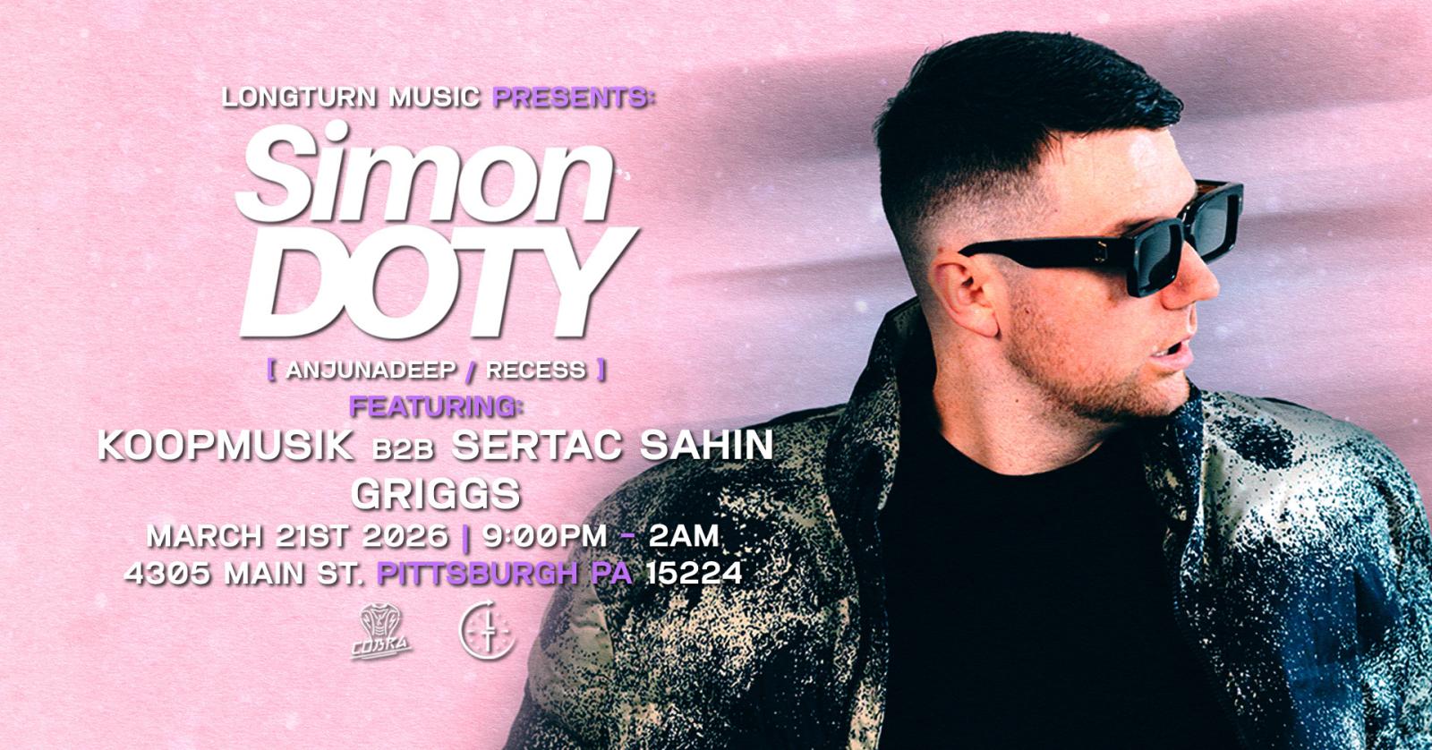 On March 21st, the Night Shift welcomes back Anjunadeep's Simon Doty for his second run in Pittsburgh, and he's coming in hot. The Canadian producer has been on a tear, leaving his breakthrough album 'Universal Language' behind to push deeper into groove-based club music through his own Recess imprint and the relentless Reup project. A self-taught gear whiz whose gritty textures and driving grooves have earned regular spins from Pete Tong and Danny Howard on BBC Radio 1 and co-signs from Hot Since 82 and Jamie Jones, he has been stacking marquee performances at Brooklyn Mirage, Red Rocks, Fabric London, and beyond. If you caught him the first time, you already know - this one is not to be missed.