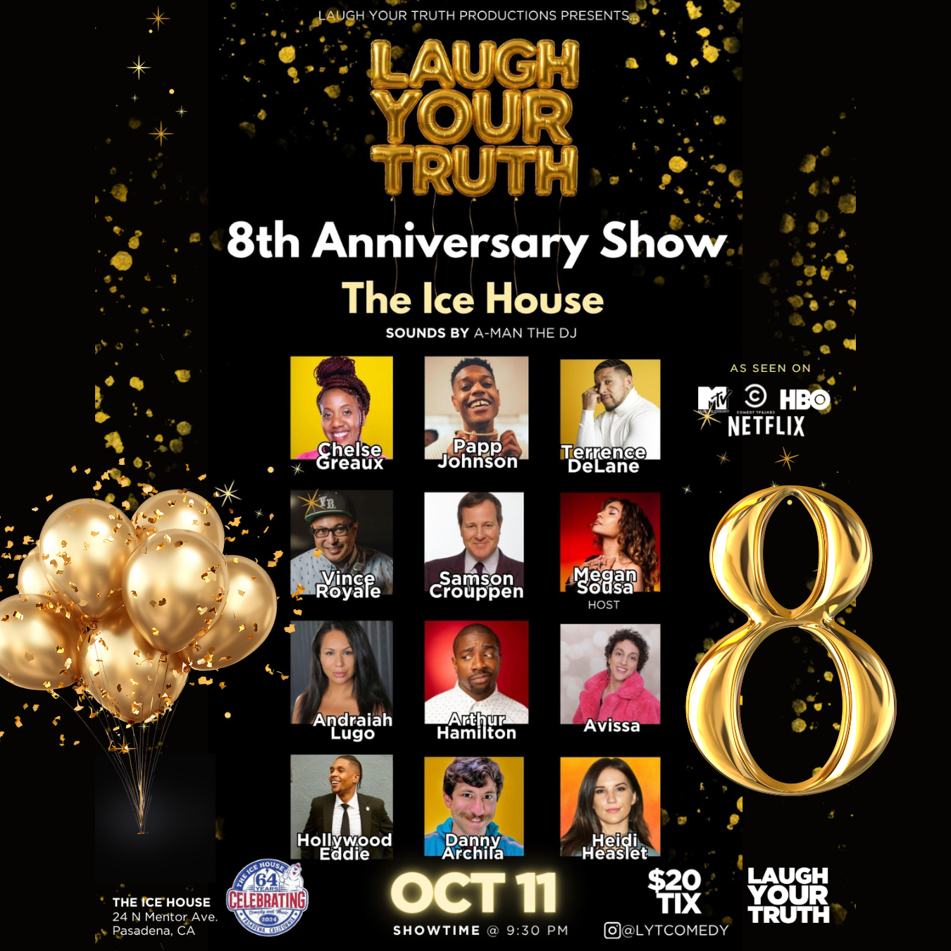 On October 11, The Ice House is the place to be. We’re throwing down for 8 years of LYT Comedy — celebrating the laughs, the community, and all the moments that got us here. Expect a stacked lineup, surprise guests, and a night you’ll be talking about long after the lights go down. Tickets won’t last — grab yours now and be part of the celebration.