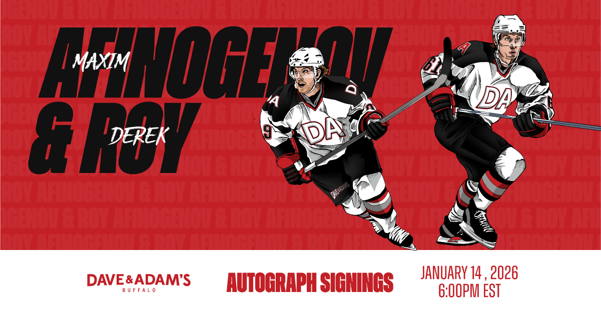 Join us at Dave & Adam’s for a dual autograph signing with Buffalo Sabres fan favorites Max Afinogenov and Derek Roy, two key contributors to the unforgettable 2005–06 Sabres season. .