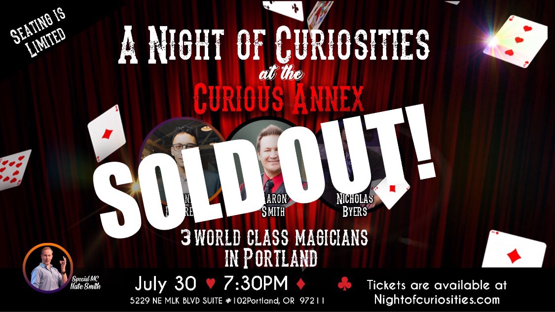 A Night of Curiosities at the Curious Annex returns on July 30 for another exciting night of magic and laughter. Portland favorites Brandon Lawrence and Aaron Smith are joined by Seattle’s very own Nicholas Byers and will share their talents to prove the impossible is possible in this wonderful hour of magic and mayhem.