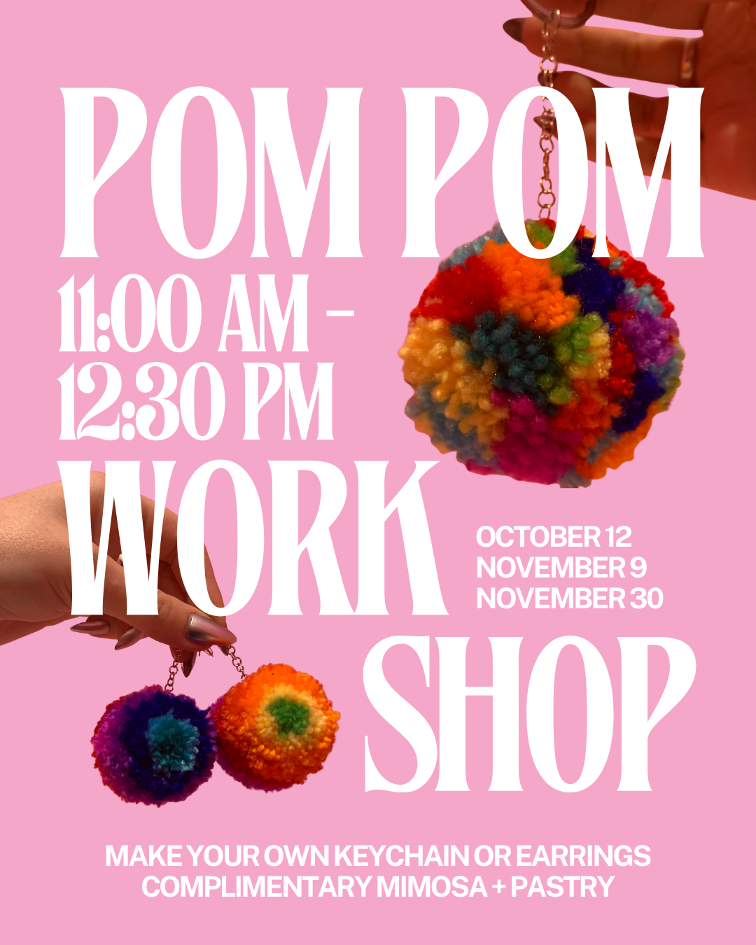 - Your choice of yarn and all materials to make a custom pair of pom pom earrings or pom pom keychain.
