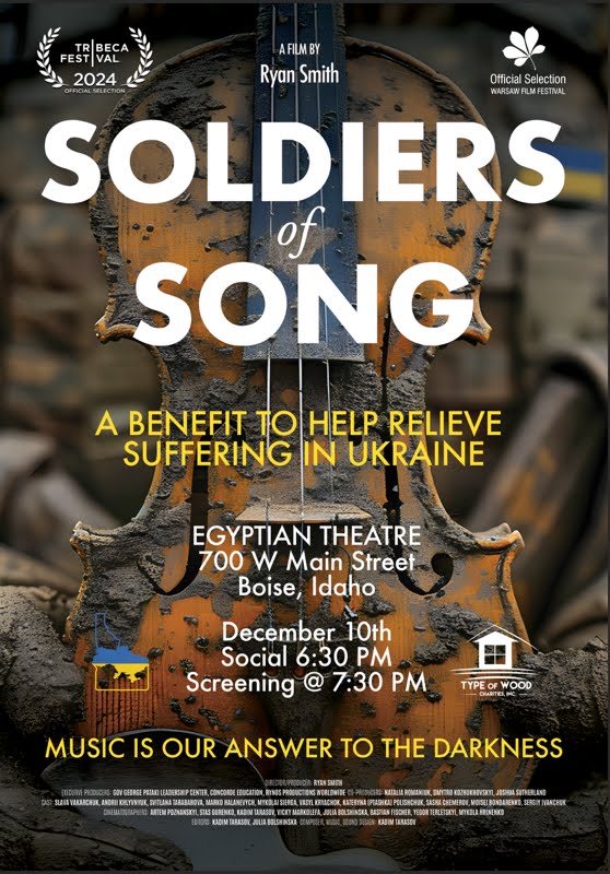 Idaho Humanitarian Aid for Ukraine and Type of Wood charities, together with the gracious assistance of the Egyptian Theatre, are hosting the screening of Ryan Smith's documentary film "Soldiers of Song." The film premiered at the 2024 Tribeca Film Festival and has been screened at film festivals throughout the world. It is a moving testament to the unflinching efforts of Ukraine's most iconic musicians to unite their war-torn nation through the healing power of music.