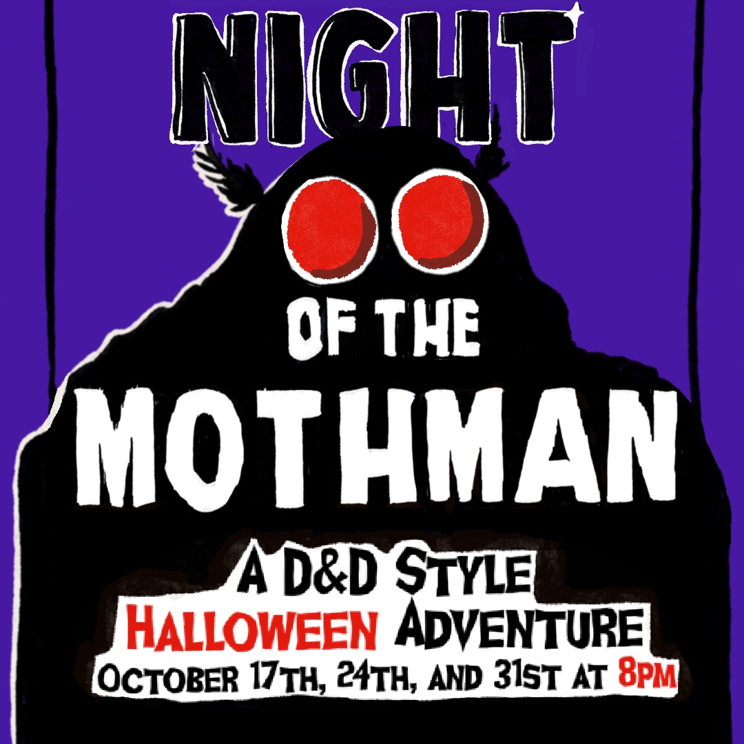 It’s Halloween night, 1991, and a rambunctious group of trick-or-treaters must retrieve their stolen candy from a haunted cabin in the woods. However, when a mysterious force transforms them into their costumes, the gang must use their magical new abilities to save the kidnapped Moth Man! This brand new table top role playing game show is based on NIGHT OF THE MOTH MAN, a Bedlam Arts and Goods game by Pittsburgh-based designer Eamon McNamee. Each night is a new adventure in this spooky D&D-style comedy show. Or you catch all three nights to witness the full terror that is NIGHT OF THE MOTH MAN.