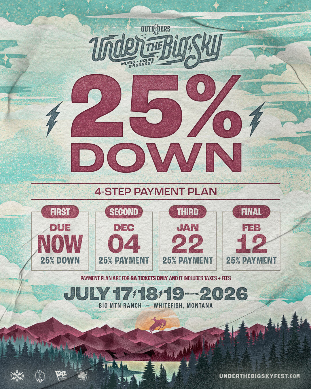 Tickets are for Under the Big Sky Festival as a whole, not for any specific artist. Artists, venue details, and schedules may change without notice. Artist cancellations do not qualify for refunds. This is a non-smoking event. The festival will take place rain or shine.
