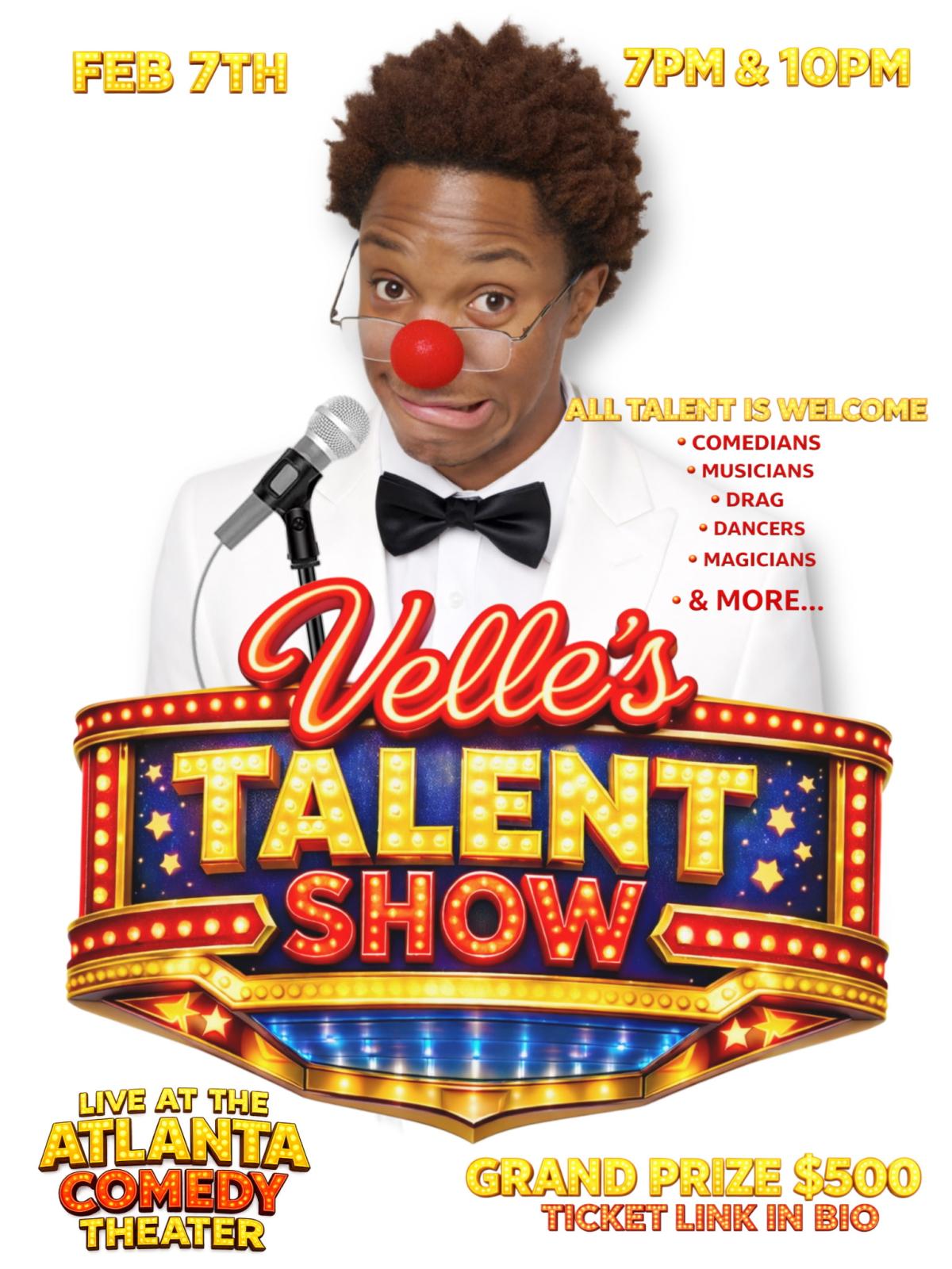 VELLE'S TALENT SHOW. All talents Welcome from "Comedians, Musicians, Drag, Dancers, Magicians,