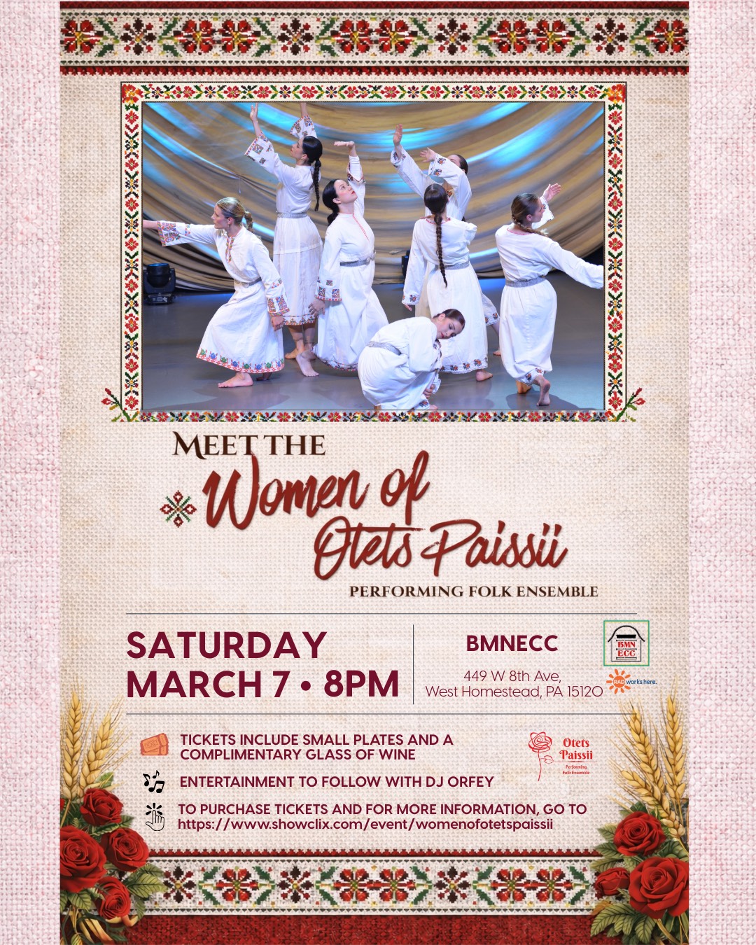 Warning Oh, no! You don't have JavaScript enabled!Javascript is required to use this website and to purchase tickets. Share Share Tweet Add to Calendar Set Reminder Mar 07 Meet the Women of Otets Paissii Sat. Mar 7, 2026 at 8:00pm EST All Ages 26 days away All Ages Get Tickets Details Event Stats 26 days away All Ages Event Description Comments Reserve Tickets Quantity 0 1 2 3 4 5 6 7 8 9 10 BMNECC Member Admission $30.00 Quantity 0 1 2 3 4 5 6 7 8 9 10 Non - Member Admission $35.00 Quantity 0 1 2 3 4 5 6 7 8 9 10 Child (12 and under) Admission $15.00 One of your subscriptions does not meet the requirements Venue Details BMNECC 449 West Eighth AvenueWest Homestead, PA 15120